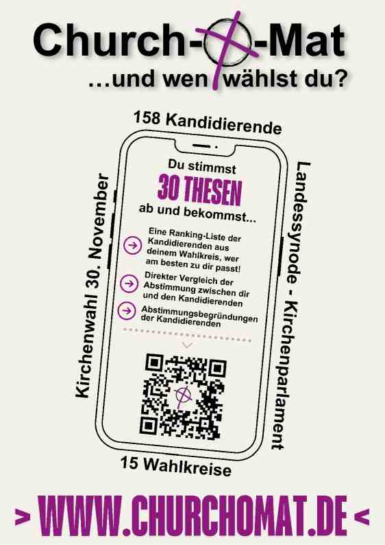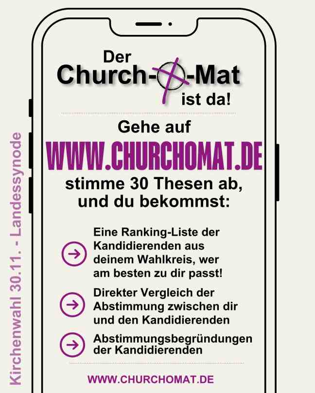 Für die Wahl der Landessynode (ebenfalls am 30.11.) könnte Ihnen der „Churchomat“ eine wertvolle Hilfe sein. Das funktioniert ähnlich wie der mittlerweile bekannte „Wahlomat“ bei weltlichen Wahlen: Sie beantworten einige Fragen und erhalten dann ein Ergebnis, welcher der Kandidaten am ehesten Ihre Anschauung vertritt.