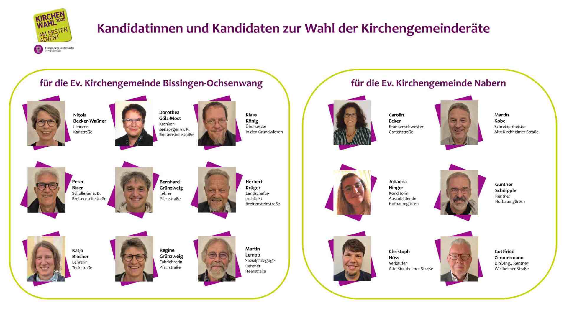Kirche lebt und bekommt ein Gesicht durch Menschen, die sich einbringen. Am 30. November 2025 werden die Kirchengemeinderäte in Bissingen-Ochsenwang und Nabern neu gewählt. Unten sehen Sie die Kandidaten für Bisingen-Ochsenwang und Nabern.