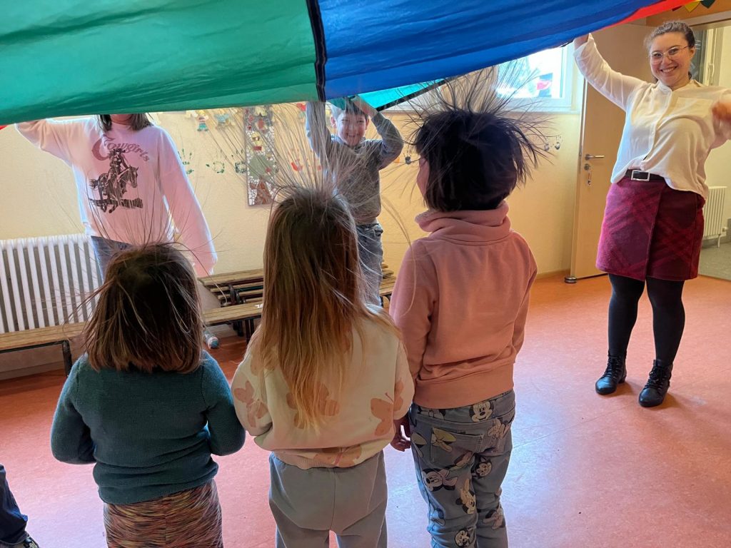 Die Kinder durften einen Papierstern anmalen, ausschneiden und dann darauf schreiben, was sie sich für dieses Jahr wünschen, zum Beispiel  Gesundheit und Glück. Die Zeit bis zum Ende haben wir dann für Spaß mit dem Schwungtuch genutzt (siehe Foto). Nach viel Lachen sind die Kinder glücklich nach Hause gegangen.